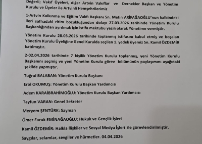 Çok üzüntülü ve olağanüstü günler yaşamamız sonucunda Ramazan bayramımızın,Artvinlilere Artvin sevenlere ve ülkemiz insanlarına daha iyi ve sevinçli günlerde kutlamak üzere kutlu olmasını diler yönetim kurulu adına sağlık ve mutluluklar dilerim.